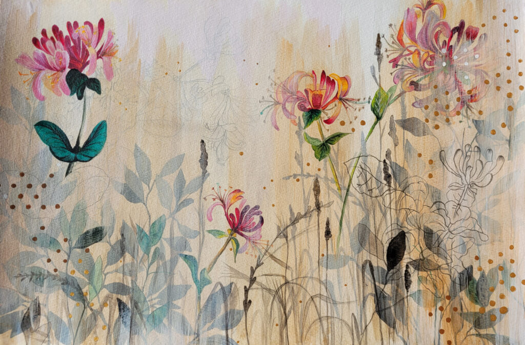 Keywords: painting, drawing, acrylic, paper, contemporary, illustration, decor, original painting, small, honeysuckle, fantasy