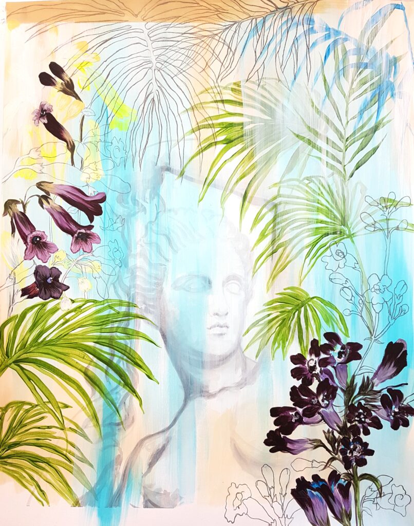 Keywords: painting, acrylic, paper, leaves, contemporary, modern, decor, original painting, expressionism, leaves, woman, dreamy, fantasy, flower, figurative, sculpture, palm, penstemon, plant, tropical, woman bust sculpture